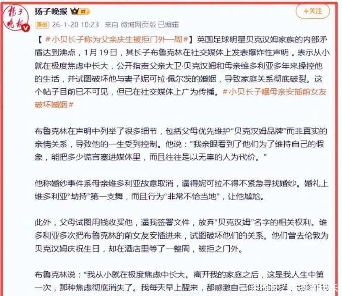 谁有权定义他的婚姻?谁有权讲述他的故事?谁有权决定他的幸福标准?答案在他自己手里。他不再是那个需要父母背书的少年。他已是丈夫,是创业者,是独立个体。他可以接受不被理解,但不能接受被操控。他选择用最直接的方式——公开声明——切断那些看不见的线。这不是崩溃,而是重建。他重建的不是家庭关系,而是自我边界。他允许自己愤怒,允许自己失望,也允许自己不再回头。他的声明没有哀求,没有眼泪,只有冷静的陈述和坚定的立场。他列举事实,不渲染情绪;指出问题,不煽动对立。这种克制反而更具力量。因为他不是在攻击父母,而是在宣告主权。他的生活,他的婚姻,他的选择,从此由他自己负责。外界或许会继续猜测、评判、消费这段家庭恩怨。但他已不再在乎。他在佛罗里达的阳光下开始新生活,在厨房里研究食谱,在品牌工作室里打磨产品。这些日常,微不足道,却完全属于他自己。没有镜头,没有脚本,没有“贝克汉姆”前缀。他终于可以只是布鲁克林。而尼古拉,也不再是“贝克汉姆家的儿媳”,而是他并肩同行的伴侣。他们不需要豪门认可,也不需要公众祝福。他们只需要彼此的信任,和不受打扰的平静。这场决裂,表面看是家庭悲剧,实则是个人觉醒。他付出了亲情疏离的代价,换来了精神上的完整。
